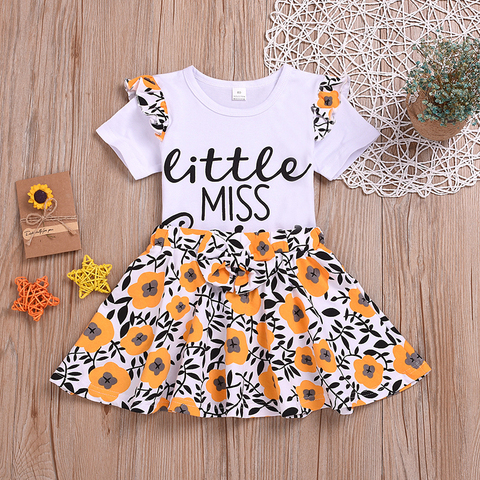 Zomer Meisje Korte Mouw Letter Print Chrysant Rok Met Katoenen Stof Baby Meisje Kleding Set