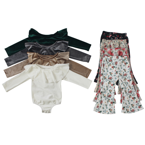 0-2T Katoen Herfst Fluwelen Lotusblad Kraag Top Romper 2 Stuks Print Bell Bottom Broek Baby Meisjes kleding Set