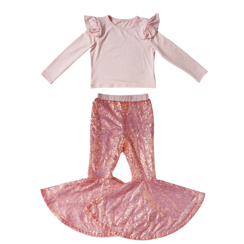 2025 Groothandel Kinderkleding Roze Pailletten Bell Bottoms Broek Lange Mouw Top Meisjes Kleding Sets